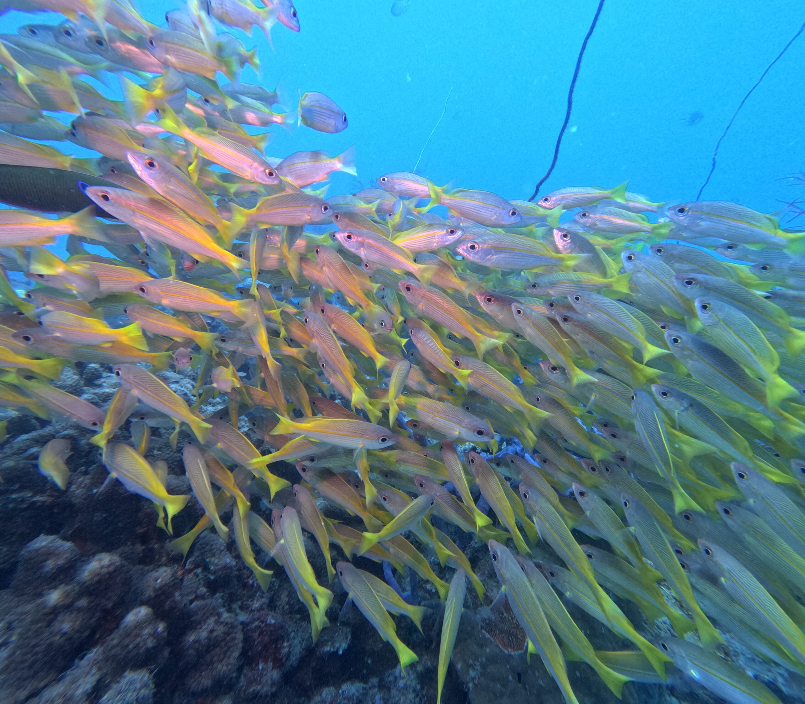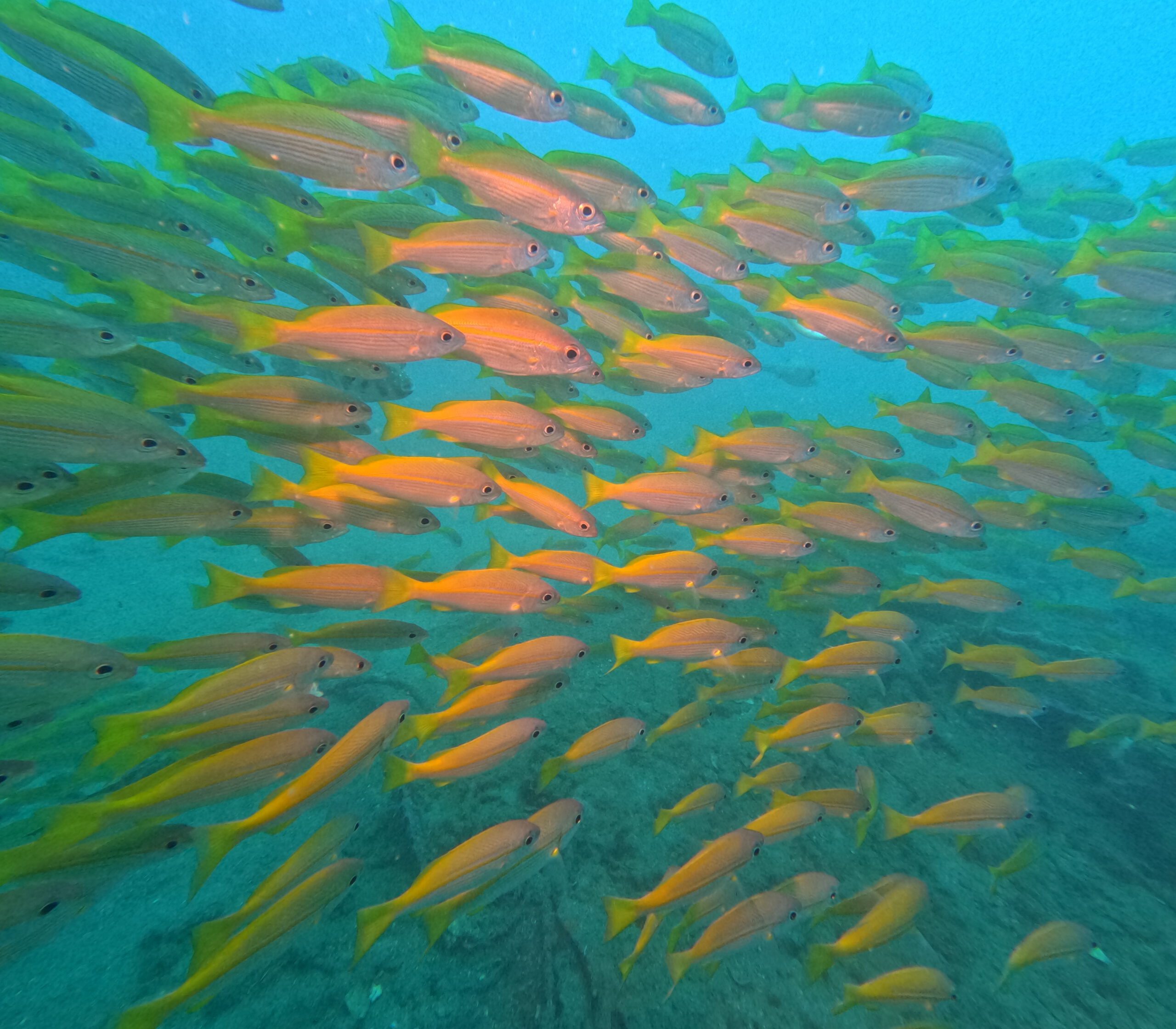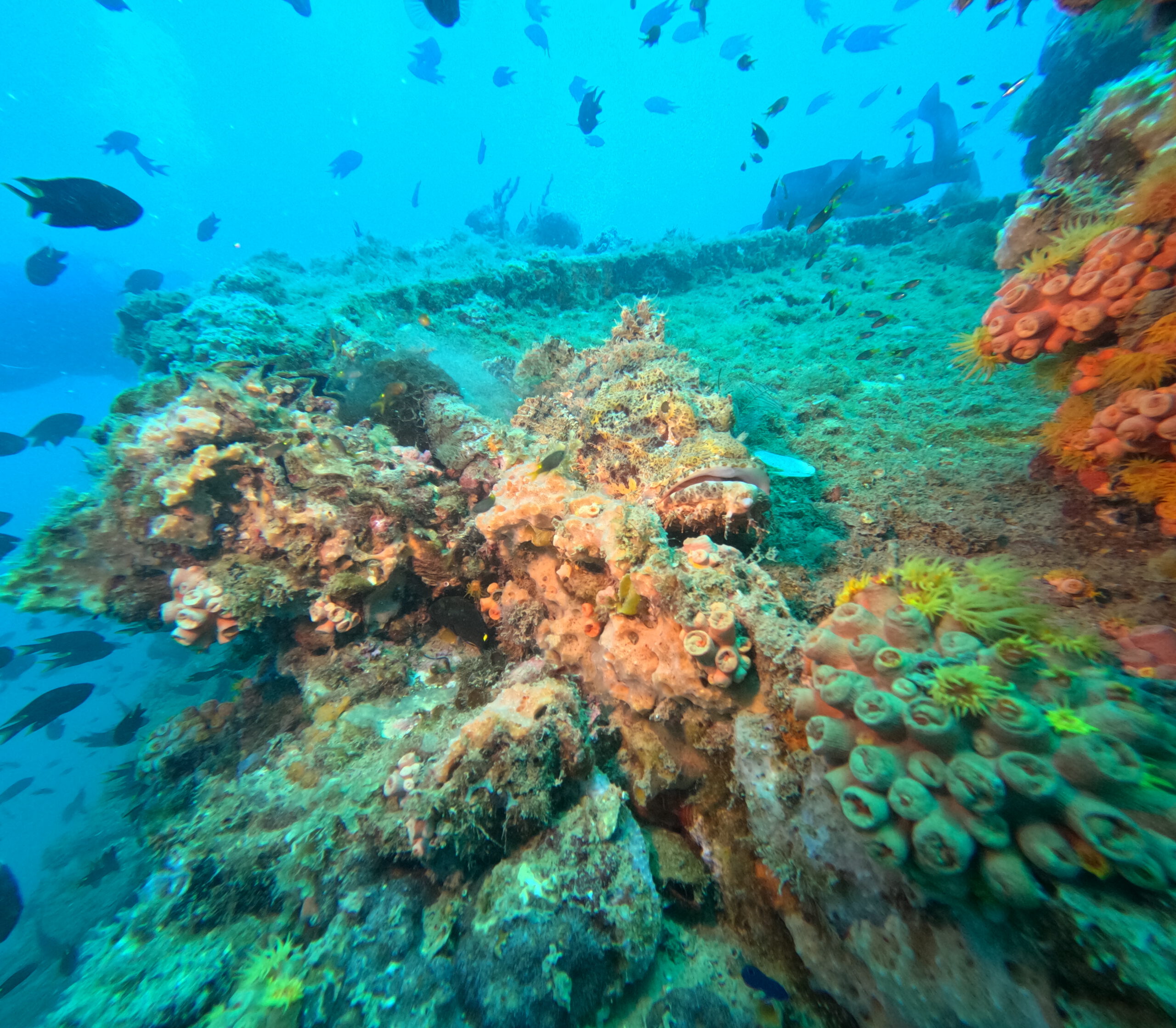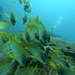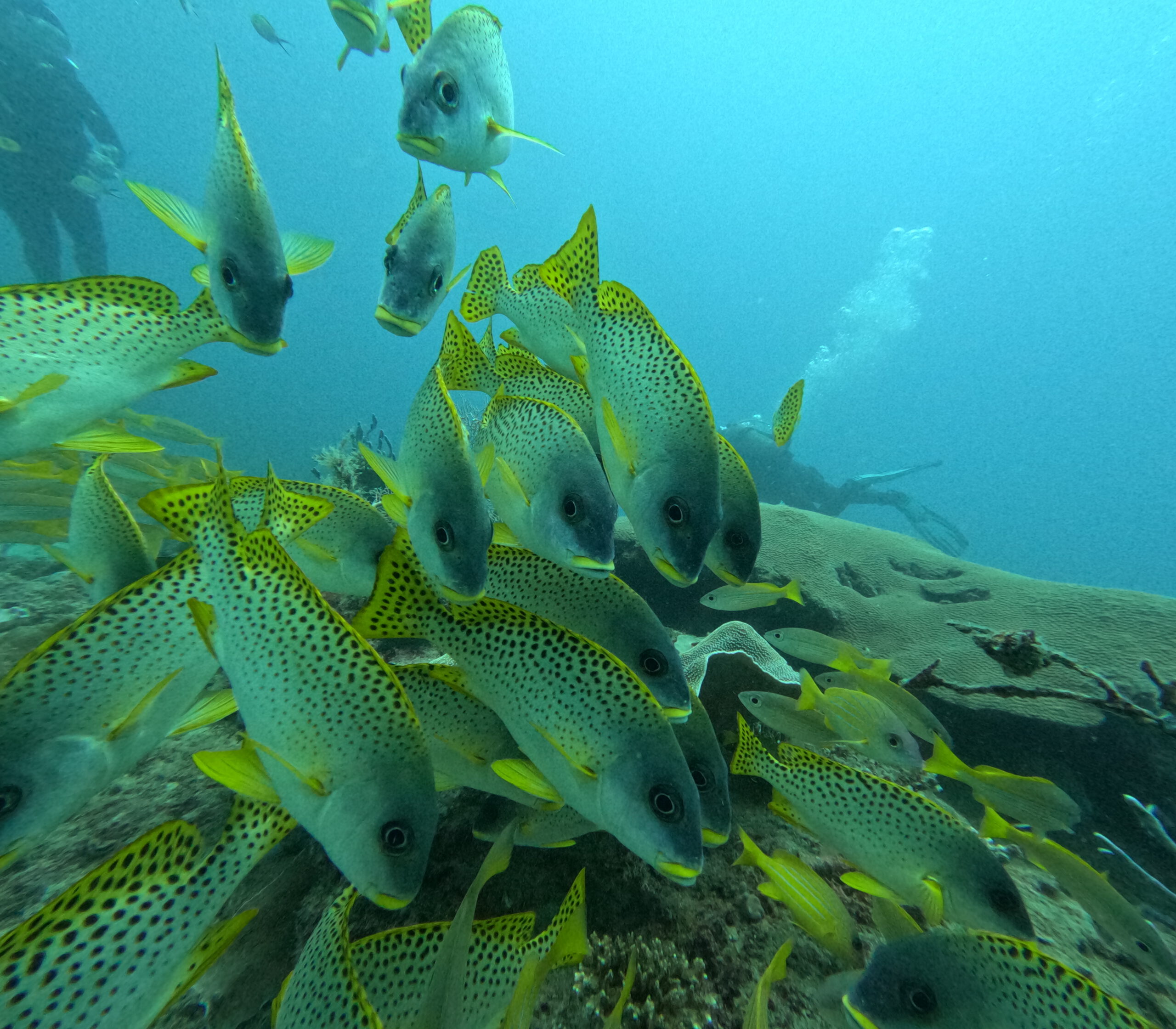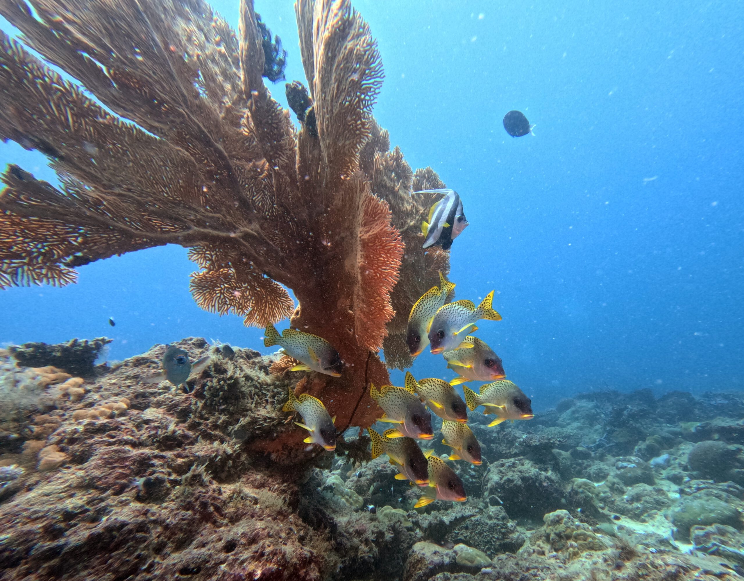 Die hochgelobten Tauchplätze sind seit dem Lockdown leider Überfischt. Sicherlich gibt es einige Schildkröten, Krokodilsfische, Riffhaie, Delfine und andere Rifffische, aber bei weitem nicht mehr so wie vor 2020 zu sehen. (Stand 10/2025). Buckelwal von weitem (Ende Oktober).